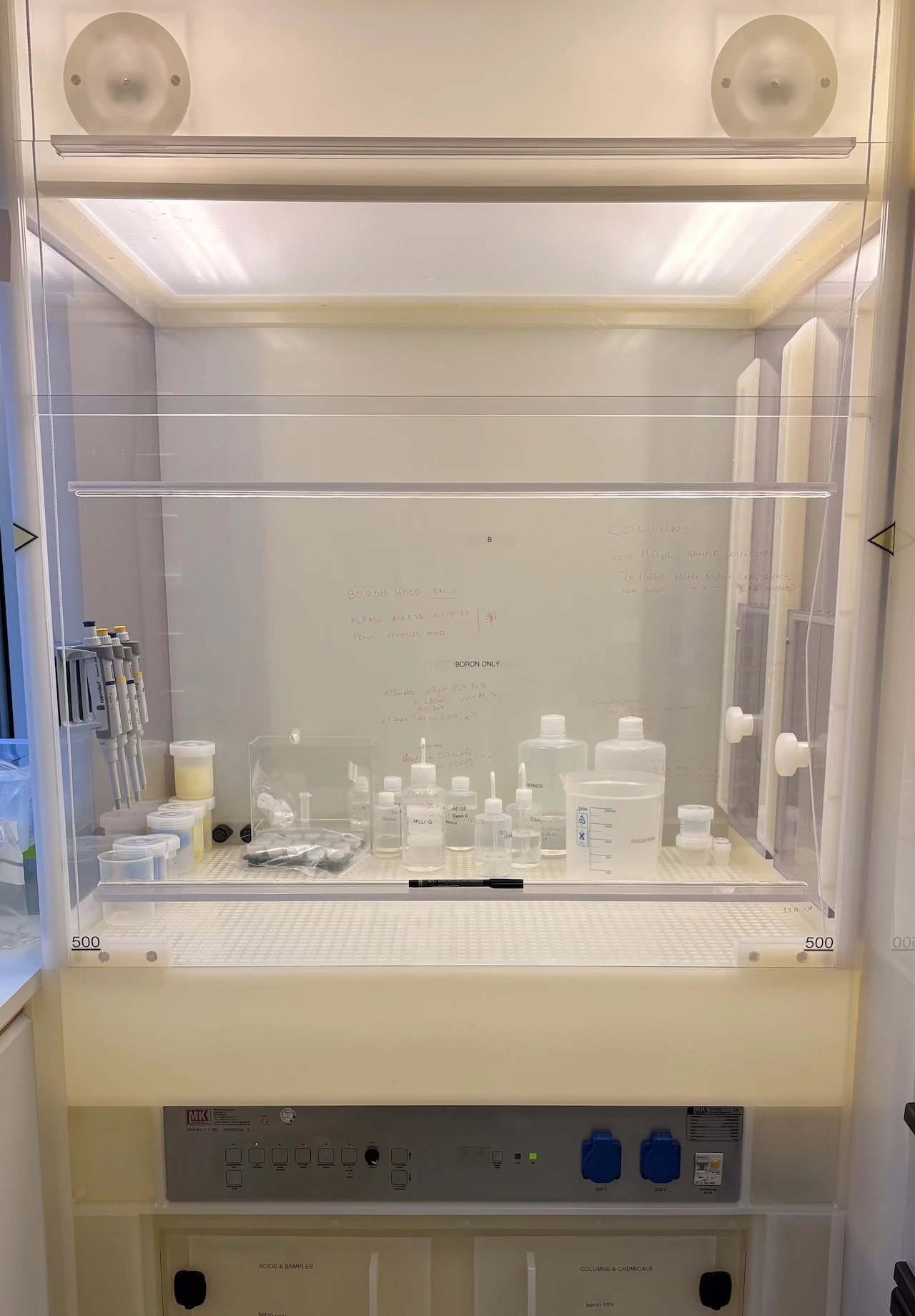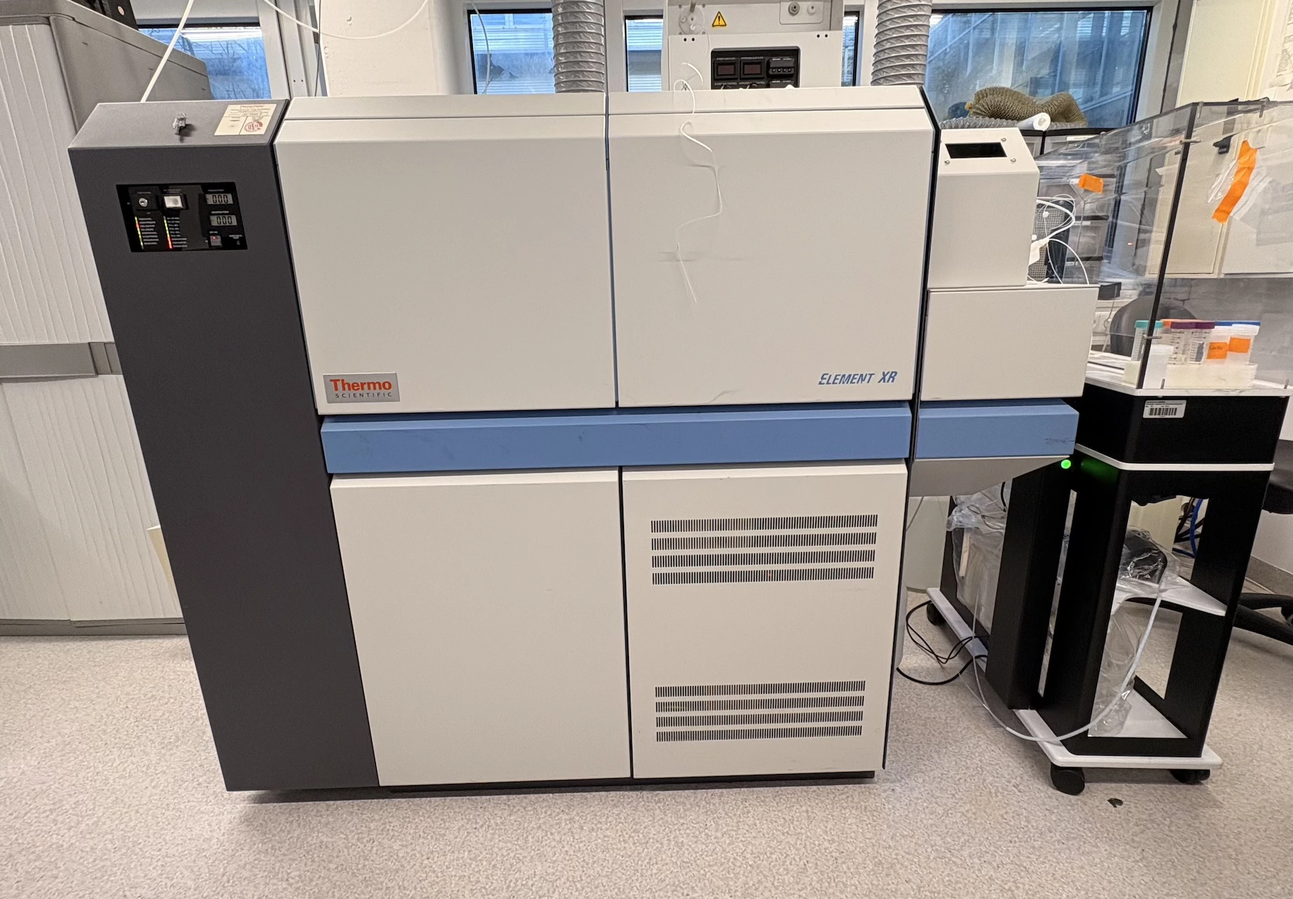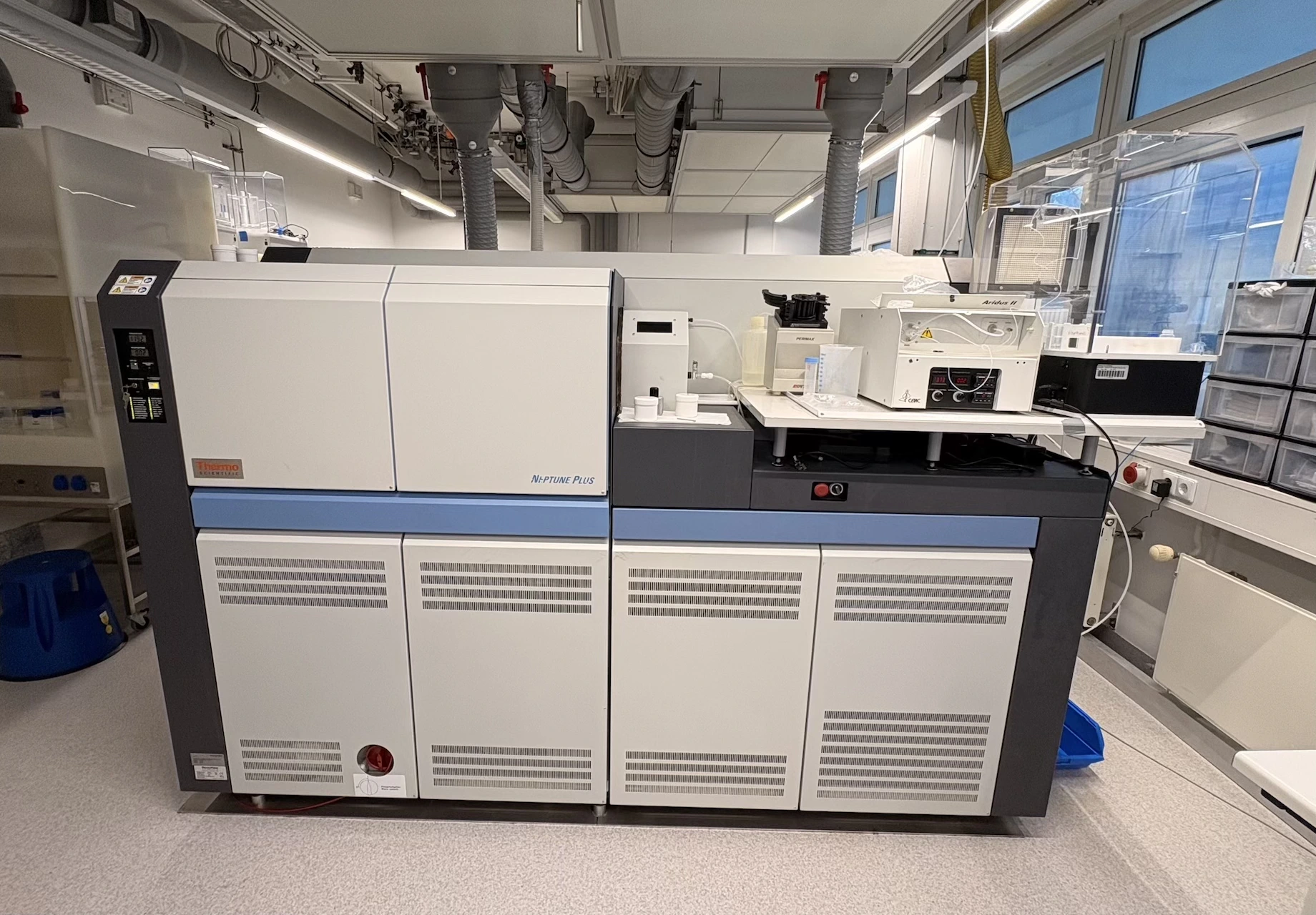 In our Instrument lab, we are using two different communally shared mass spectrometers. Boron isotope analyses are getting performed using a ThermoScientific Neptune Plus Multicollector Inductively Coupled Plasma Mass Spectrometer (MC-ICP-MS). For trace element analyses, a ThermoScientific Element XR High Resolution Inductively Coupled Plasma Mass Spectrometer (HR-ICP-MS) is being used.